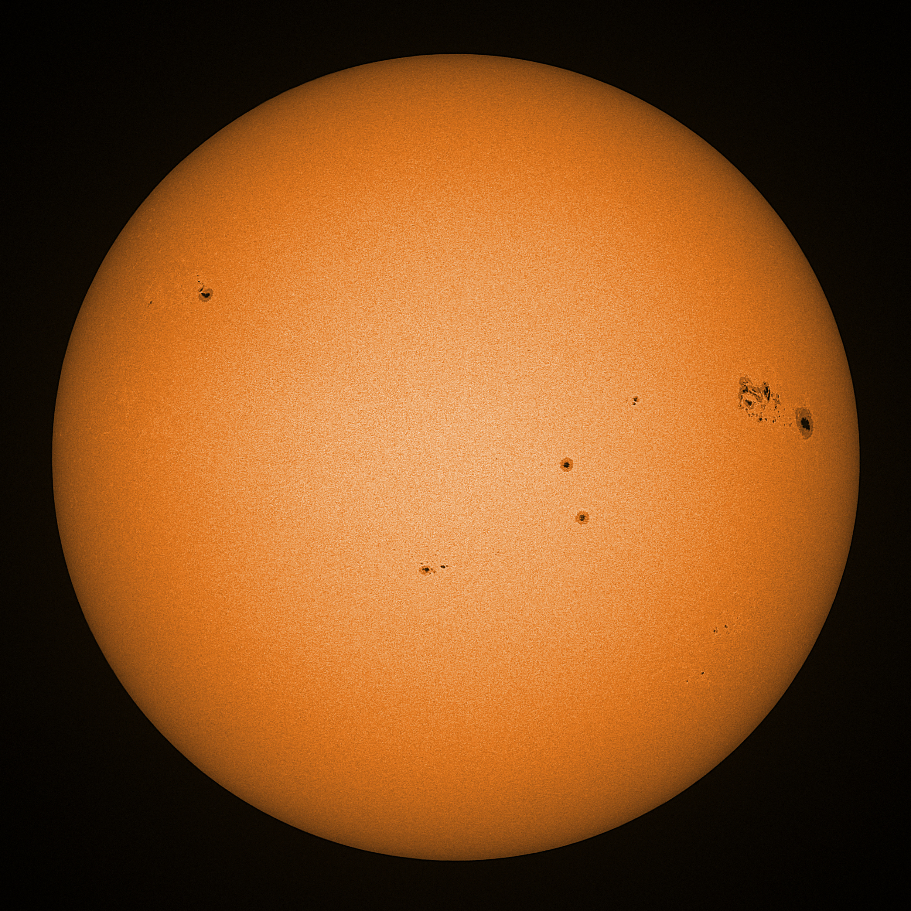 Observation date/time: 08 February 2026 09:56 UTC Telescope: GTT60 (Galileo Type Telescope) Focal length: 1490mm (plano convex singlet) Aperture: 60mm Stop: 30mm Eyepiece: -75mm (plano concave singlet, 24mm aperture) Observation type: projection (338mm distance, 80mm diameter) Reference: Earth's rotation axis Exposure (transparency): 0.680ms (using 82nm bandwidth green filter) Seeing (SSSMon): 2.0-2.4" (1.4" at best) =================================================================== Total number of sunspots: 37 | |