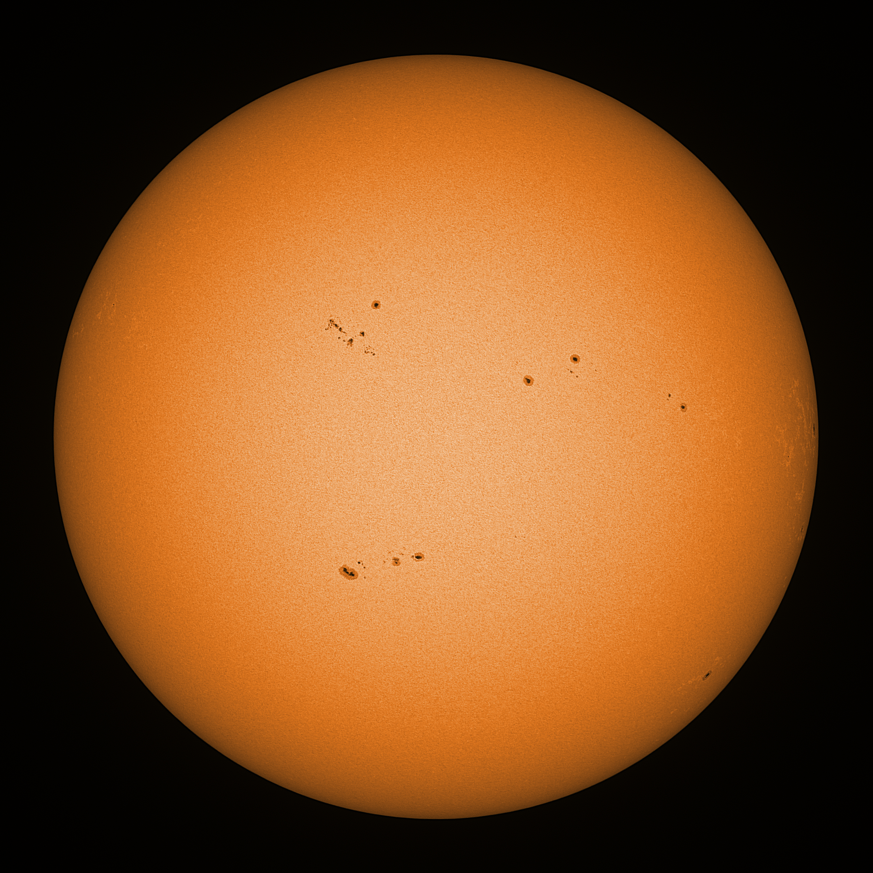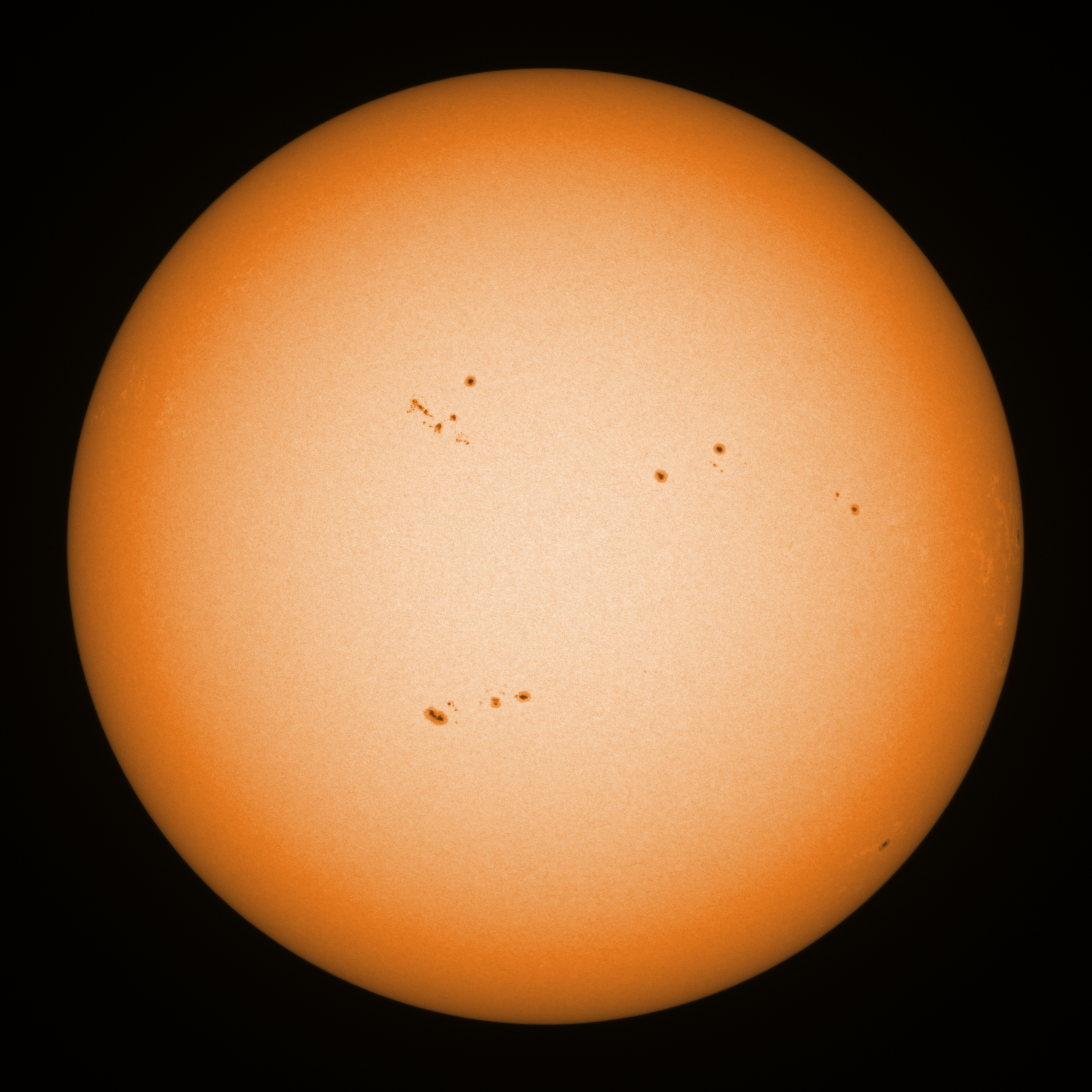 Observation date/time: 02 April 2026 13:38 UTC Telescope: GTT60 (Galileo Type Telescope) Focal length: 1490mm (plano convex singlet) Aperture: 60mm Stop: 30mm Eyepiece: -75mm (plano concave singlet, 24mm aperture) Observation type: projection (345mm distance, 80mm diameter) Reference: Earth's rotation axis Exposure (transparency): 0.380ms (using 82nm bandwidth green filter) Seeing (SSSMon): 3.5-4.0" (3.0" at best) =================================================================== Total number of sunspots: 32 | |