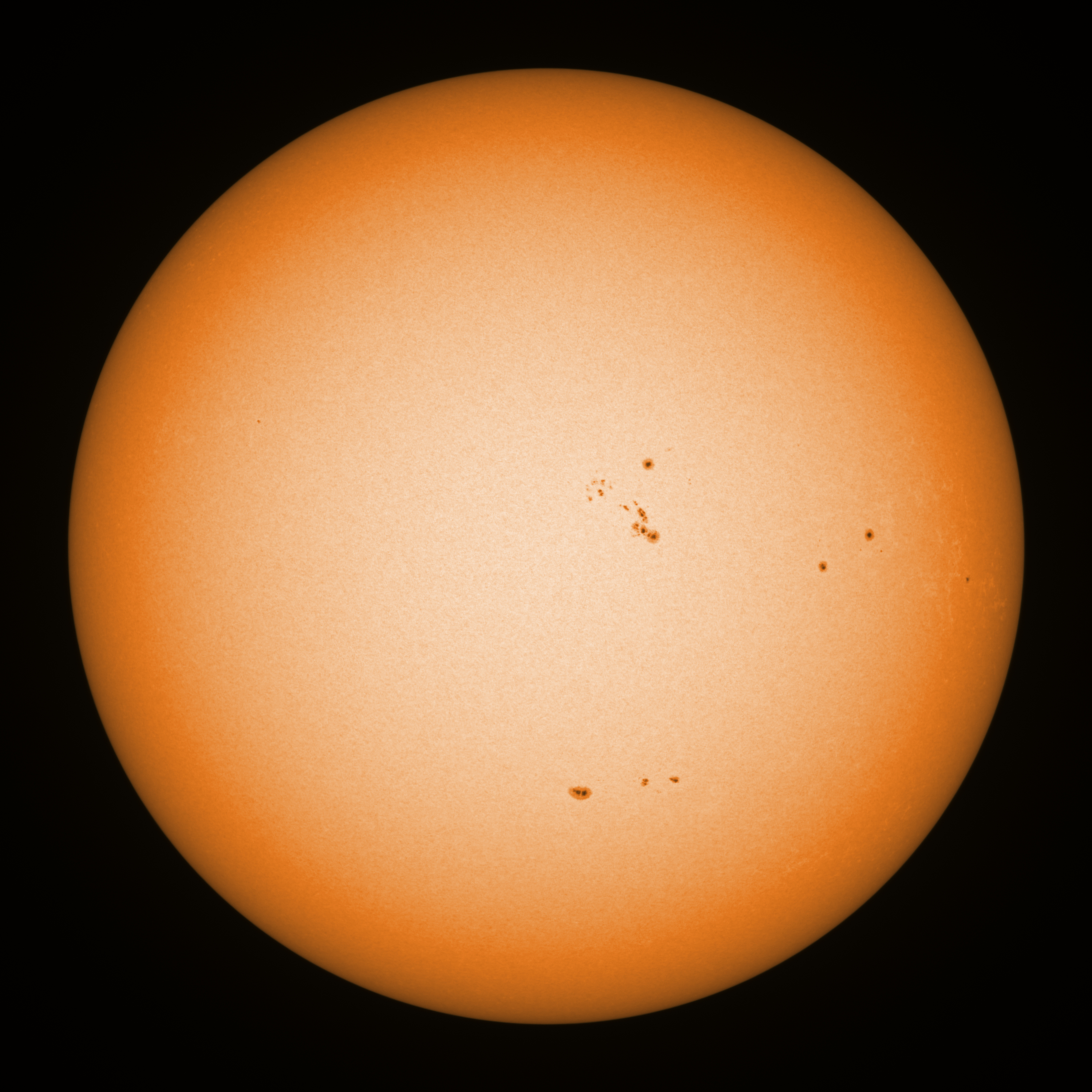 Observation date/time: 04 April 2026 09:14 UTC Telescope: GTT60 (Galileo Type Telescope) Focal length: 1490mm (plano convex singlet) Aperture: 60mm Stop: 30mm Eyepiece: -75mm (plano concave singlet, 24mm aperture) Observation type: projection (345mm distance, 80mm diameter) Reference: Earth's rotation axis Exposure (transparency): 0.380ms (using 82nm bandwidth green filter) Seeing (SSSMon): 5.0-5.5" (3.0" at best) =================================================================== Total number of sunspots: 25 | |
