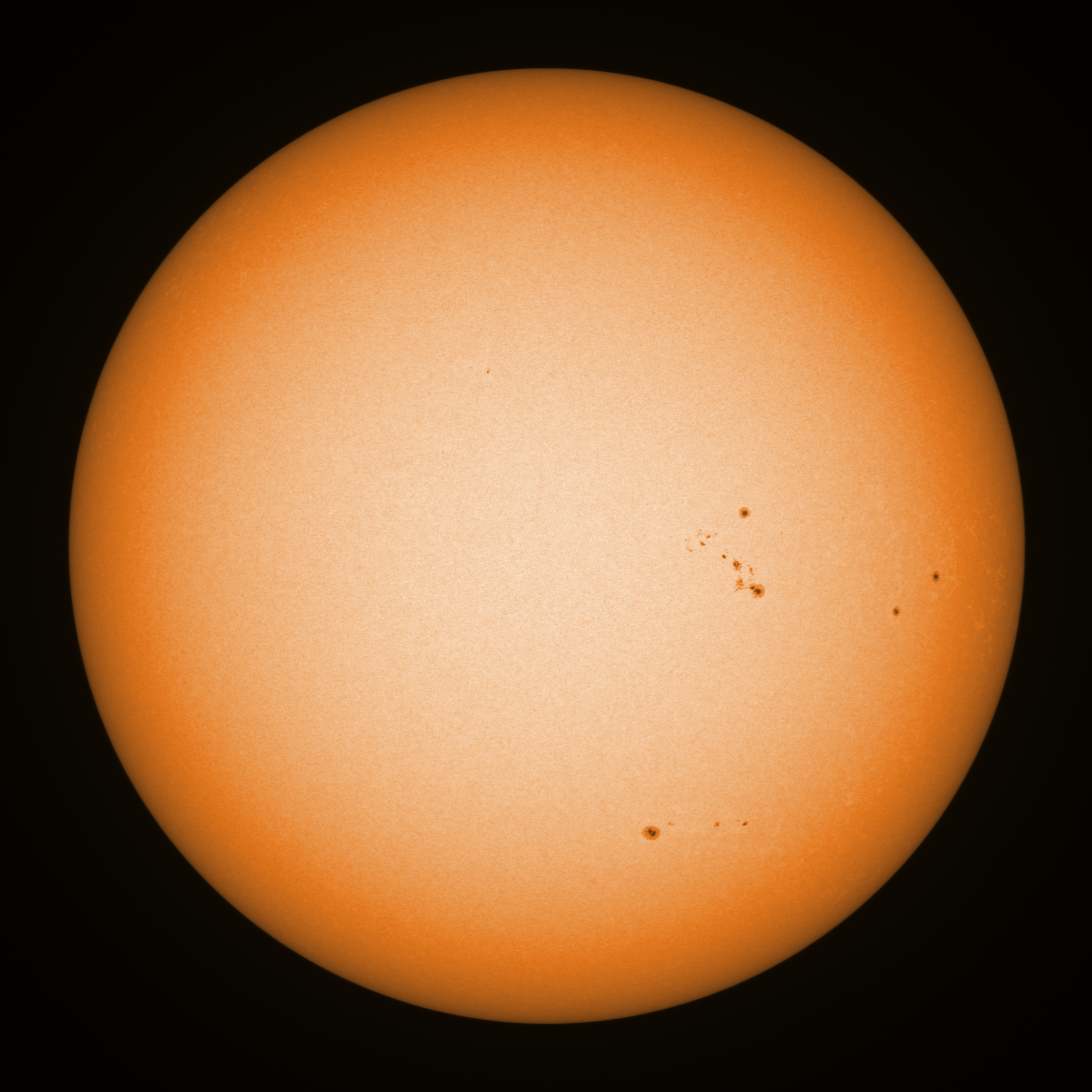 Observation date/time: 05 April 2026 09:31 UTC Telescope: GTT60 (Galileo Type Telescope) Focal length: 1490mm (plano convex singlet) Aperture: 60mm Stop: 30mm Eyepiece: -75mm (plano concave singlet, 24mm aperture) Observation type: projection (345mm distance, 80mm diameter) Reference: Earth's rotation axis Exposure (transparency): 0.380ms (using 82nm bandwidth green filter) Seeing (SSSMon): 4.0-5.0" (2.5" at best) =================================================================== Total number of sunspots: 23 | |