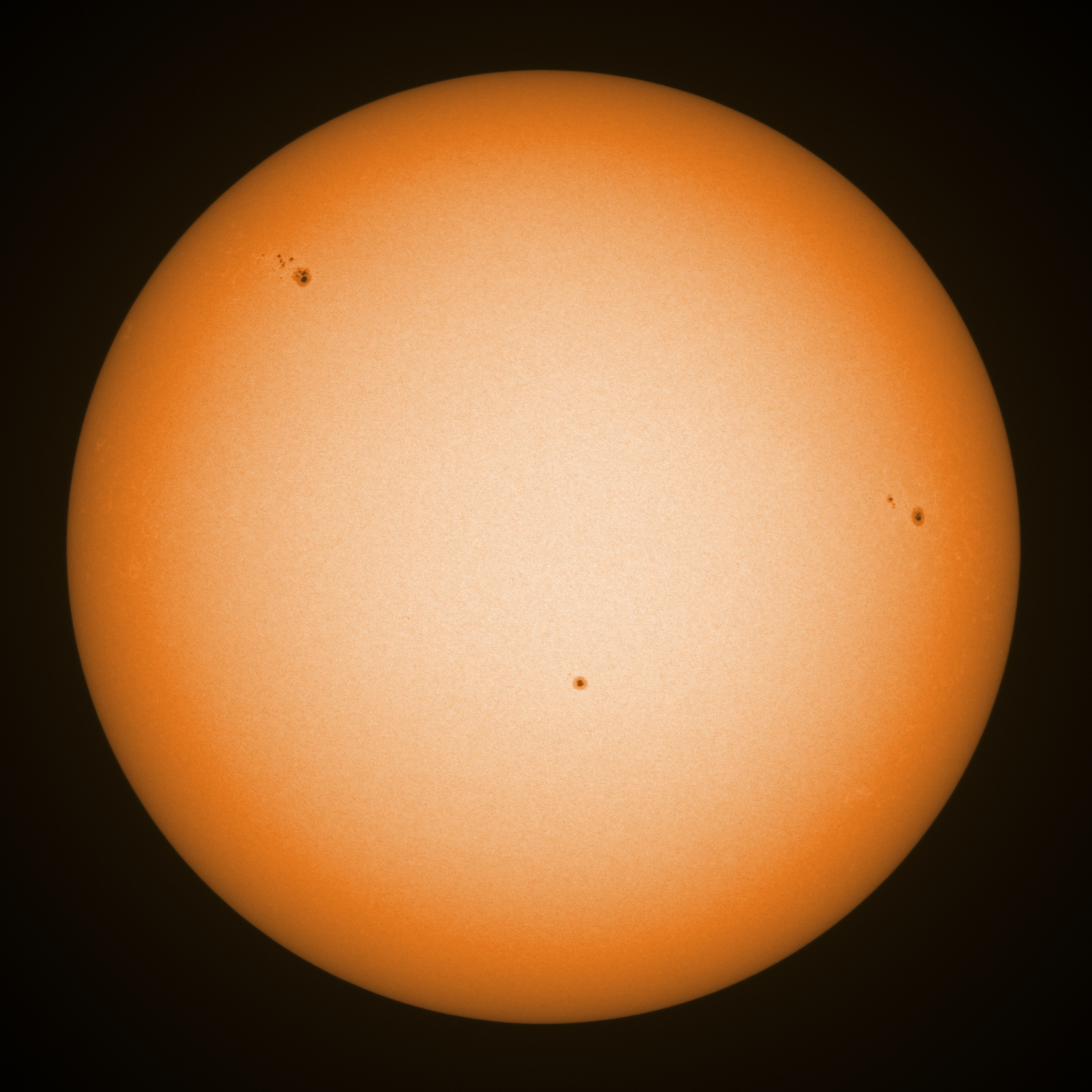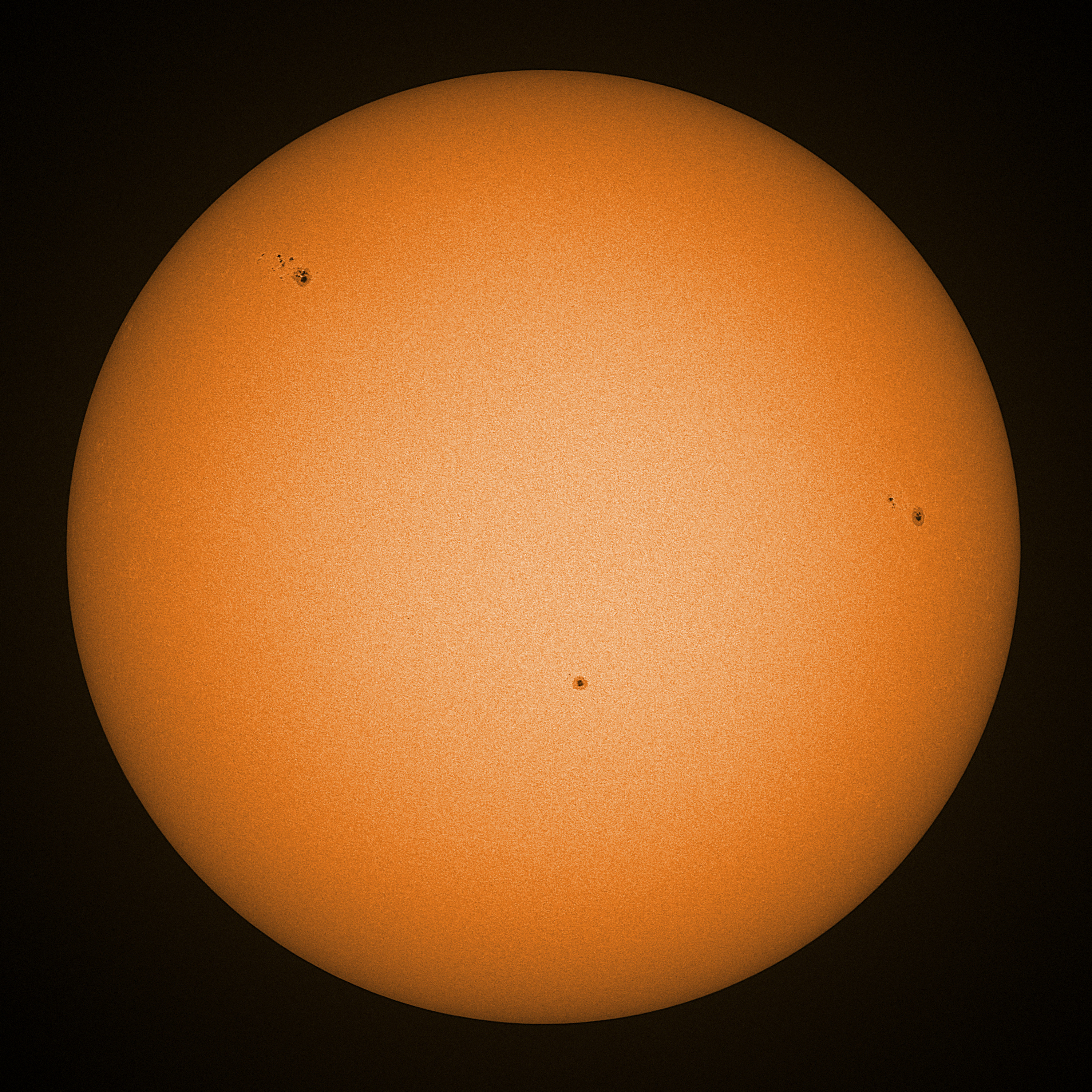 Observation date/time: 15 April 2026 11:18 UTC Telescope: GTT60 (Galileo Type Telescope) Focal length: 1490mm (plano convex singlet) Aperture: 60mm Stop: 30mm Eyepiece: -75mm (plano concave singlet, 24mm aperture) Observation type: projection (345mm distance, 80mm diameter) Reference: Earth's rotation axis Exposure (transparency): 0.680ms (using 82nm bandwidth green filter) Seeing (SSSMon): 4.0-5.0" (1.0" at best) =================================================================== Total number of sunspots: 12 | |